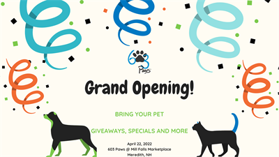 One of my clients, 603 Paws, in Meredith at the Mill Falls Marketplace next to Ben & Jerry's is having a grand opening celebration!! Light snacks, giveaways, and a ribbon-cutting ceremony at noon. She will have vendors on the spot as well!