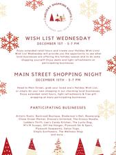 Head to Main Street, grab your loved one's Holiday Wish List, or simply do your own shopping in our charming local businesses. Enjoy extended retail hours, light refreshments & free gift wrapping at many participating businesses