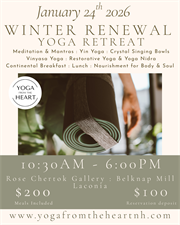 Join Yoga from the Heart for a one-day Yoga Winter Renewal Retreat! The day will include guided meditation with Clare Persson, Yin Yoga & crystal singing bowl sound bath with Maya Bhatt-Hardcastle, Vinyasa Yoga with Melissa LeVine, Restorative Yoga & Yoga Nidra with Laura Lee. Catering for breakfast & lunch provided by Annie's Catering in Laconia. We will gather at the Belknap Mill in the Rose Chertok Gallery for a full day of Yoga & nourishment for the body & soul. The mid-winter renewal needed in January.